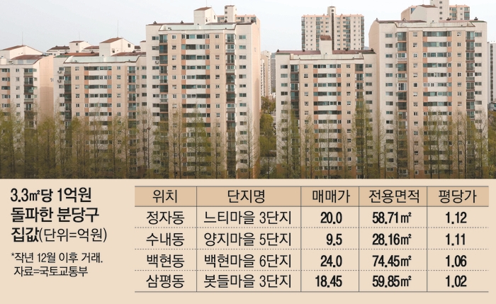 한편 최근 분당구에서는 소형 평형대를 중심으로 평(3.3㎡)당 가격이 1억원을 넘어선 계약도 다수 체결되는 중이다.국토부에 따르면 지난해 12월 이후 분당구에서는 평당 1억원이 넘는 아파트 거래가 12건 신고됐다.지난달 16일 정자동 느티마을 3단지 전용면적 58.71㎡는 20억원에 계약됐다.평당가로 환산하면 1억1242만원에 거래된 셈이다.