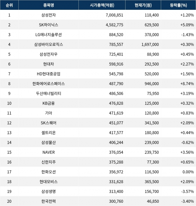 한편 시가총액 20위권 종목들은 기아(000270) ▲0.83%,SK스퀘어(402340) ▲2.09%,셀트리온(068270) ▲0.44%,삼성물산(028260) ▼0.62%,NAVER(035420) ▲3.56%,신한지주(055550) ▲0.65%,한화오션(042660) 0.00%,현대모비스(012330) ▲2.09%,삼성생명(032830) ▼3.57%,한국전력(015760) ▼3.40% 등의 성적을 기록하고 있다.