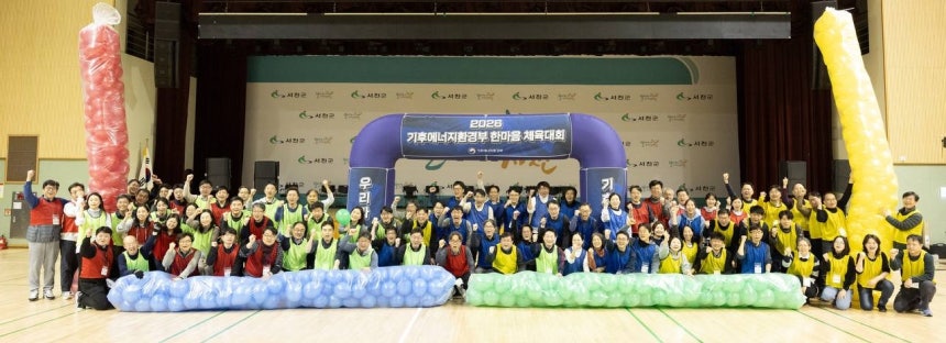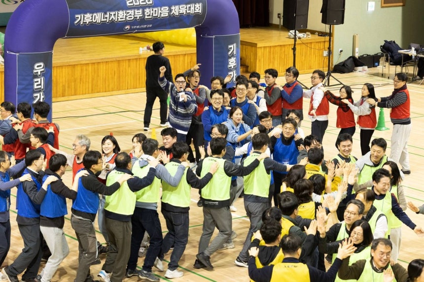 김성환 장관을 비롯한 기후에너지환경부 과장급 이상 90여명이 충남 서천국민체육센터에서 진행된‘한마음 체육대회’에서 화합의 시간을 갖고 있다.[기후부 제공]