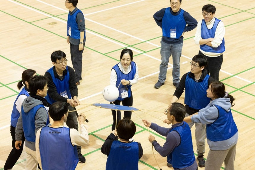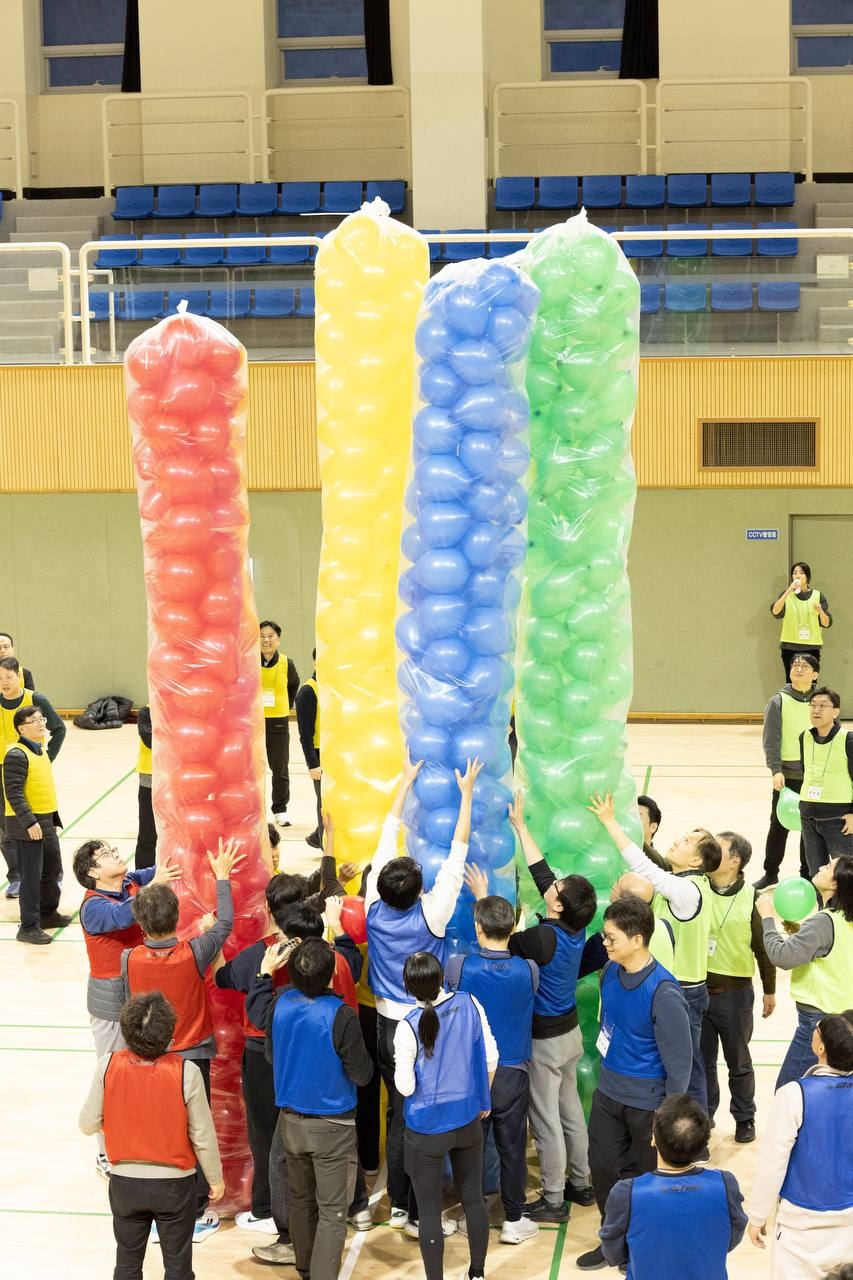 김성환 장관을 비롯한 기후에너지환경부 과장급 이상 90여명이 충남 서천국민체육센터에서 진행된‘한마음 체육대회’에서 대형풍선 탑쌓기를 하고 있다.[기후부 제공]