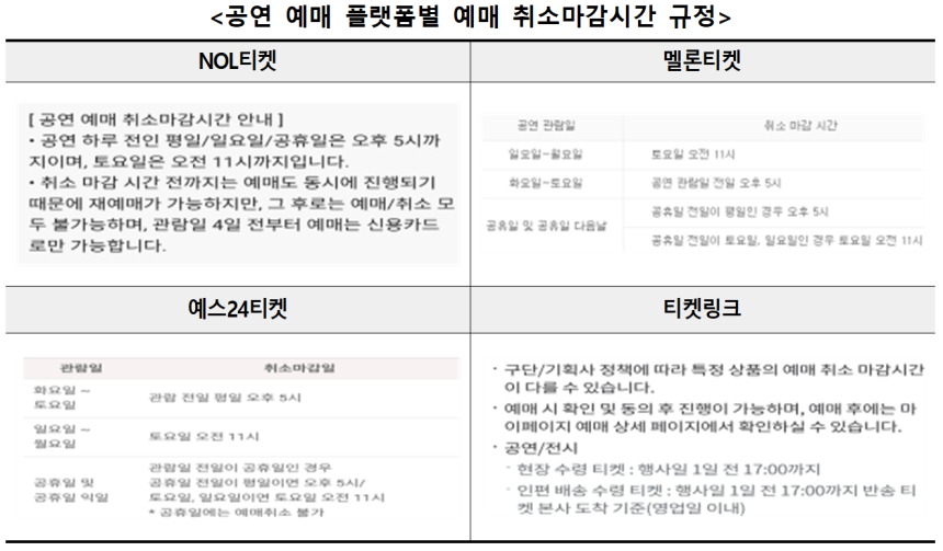 그러나 조사 대상 플랫폼 4곳 모두 공연 전날 오전 11시나 오후 5시를 취소 마감 시간으로 설정해 공연 당일 취소가 불가능한 상태였다.