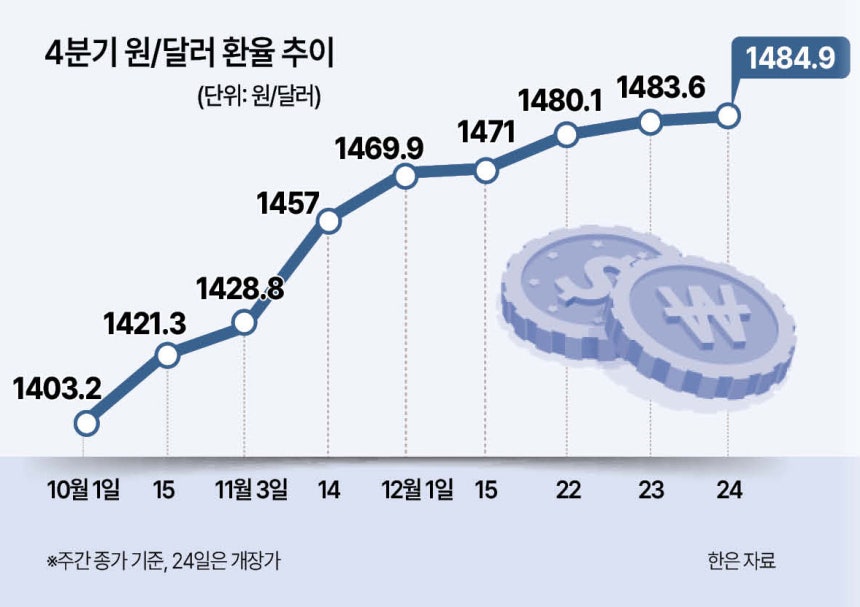 23일 미국 달러화 대비 원화 환율의 주간 거래 종가는 1483.6원으로 22일(1480.1원)에 이어 이틀 연속 1480원대로 주간 거래를 마감했다.이는 금융위기 당시인 2009년 3월 이후 약 16년 만에 처음이다.