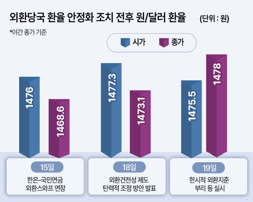 18일 기획재정부가‘외화건전성 제도 탄력정 조정 방안’을 발표한 날에도 야간 거래에서 환율은 4.2원 떨어진 1473.1원으로 마감했지만,다음날 장이 열리자 1475.5원으로 재차 올랐다.이날 한은은 임시 금융통화위원회를 열고‘한시적 외화지준 부리’등 추가 대책을 발표했는데 야간 종가는 오히려 1478원으로 상승했다.
