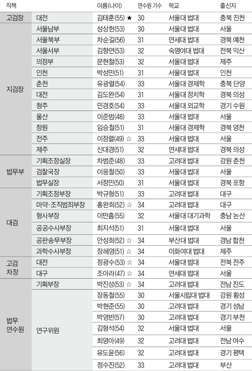 반면 김태훈 서울남부지검장은 이번 인사에서 유일하게 고검장(대전고검장)으로 승진했다.작년 7월 검사장으로 승진한 지 6개월 만이다.김 지검장은 문재인 정부에서 대검 정책기획과장·법무부 검찰과장·서울중앙지검 4차장검사 등 요직을 거쳤다.윤석열 정부 때는 부산·서울고검 검사 등으로 한직에 있었지만,현 정부로 바뀌면서 다시 중용돼 이달부터 통일교·신천지 등 정교 유착 검경 합동수사본부장을 맡고 있다.