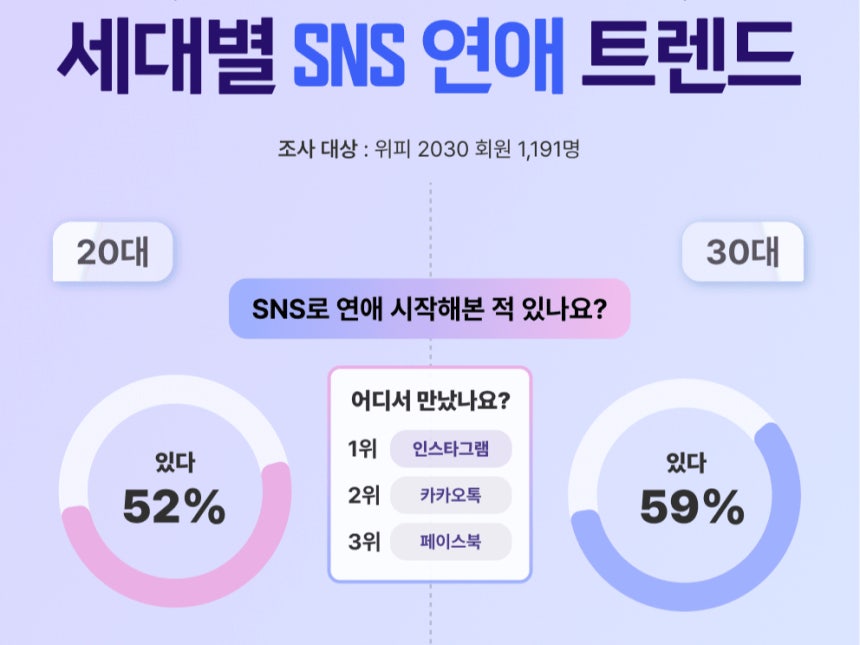 18일 소셜 데이팅앱 위피를 운영하는 엔라이즈는 위피 회원 1191명을 대상으로 진행한 '2030 SNS 연애 트렌드 리포트'에 따르면 20대와 30대 절반 이상이 소셜미디어(SNS)에서 연애를 시작해본 적 있다고 답했다.소개팅·지인소개 중심의 연애가 SNS·데이팅앱 기반의 온라인으로 빠르게 이동하고 있다는 분석이다.