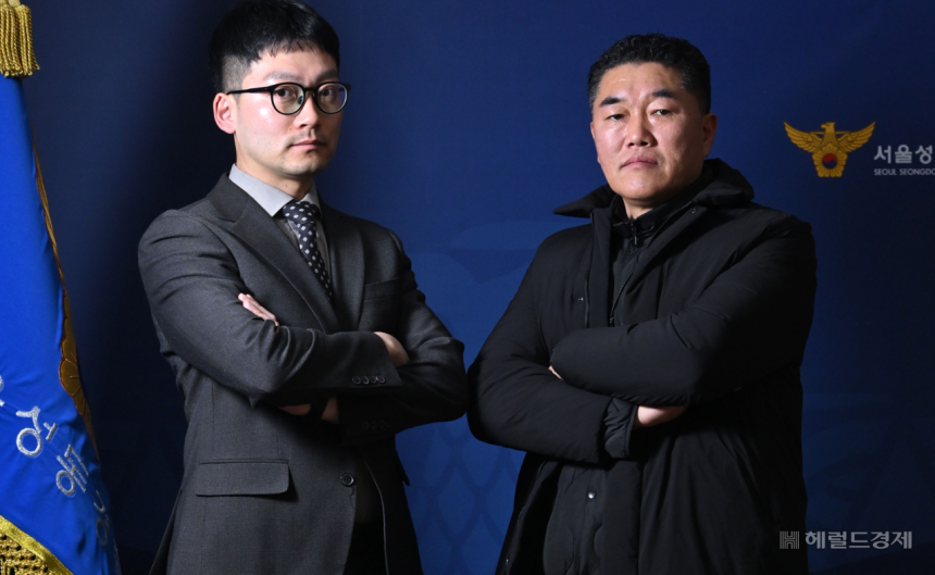 성동경찰서 수사과 지능팀 김수환 경사(왼쪽)와 교통범죄수사팀장 조장귀 경위가 22일 오후 서울 성동경찰서에서 사진 촬영에 응하고 있다.[임세준 기자]