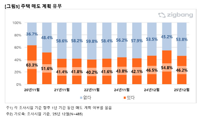 내년에 집을 팔겠다는 사람을 줄었다.향후 1년 이내에 주택을 팔겠다는 응답은 46.2%로,올 상반기(54.8%)와 비교해 10%포인트 가까이 낮아졌다.반면‘매도 계획이 없다’는 응답은 53.8%였다.매도 계획이 없다고 답한 이유로는‘실거주 목적 또는 주택 미보유’가 55.6%로 가장 많았으며‘주택 가격이 오르는 것 같아서’(11.5%)‘적절한 매도 타이밍을 지켜보려고’(10.7%)가 뒤를 이었다.