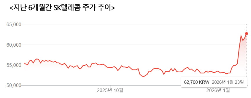 25일 한국거래소에 따르면 SK텔레콤은 지난 19~23일까지 5거래일간 주가가 13.59% 뛰었다.덩치가 크고 주가 등락폭이 상대적으로 적은 통신주치고는 이례적이다.지난 23일엔 6만2700원에 장을 마쳐 52주 신고가를 기록했다.2021년 11월 주식 액면분할을 한 이래 가장 높은 가격이다.이 가격을 웃돌면 환산 기준 26년만에 최고가를 찍게 된다.