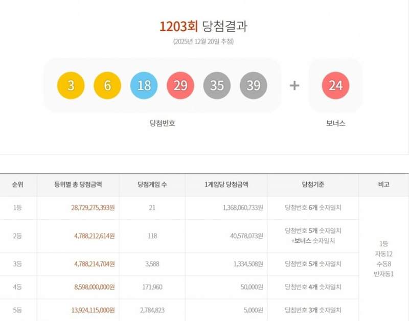 제1203회 로또 1등 당첨 번호는 '3,6,18,29,35,39'로 당첨 번호 6개를 모두 맞힌 1등은 21명입니다.