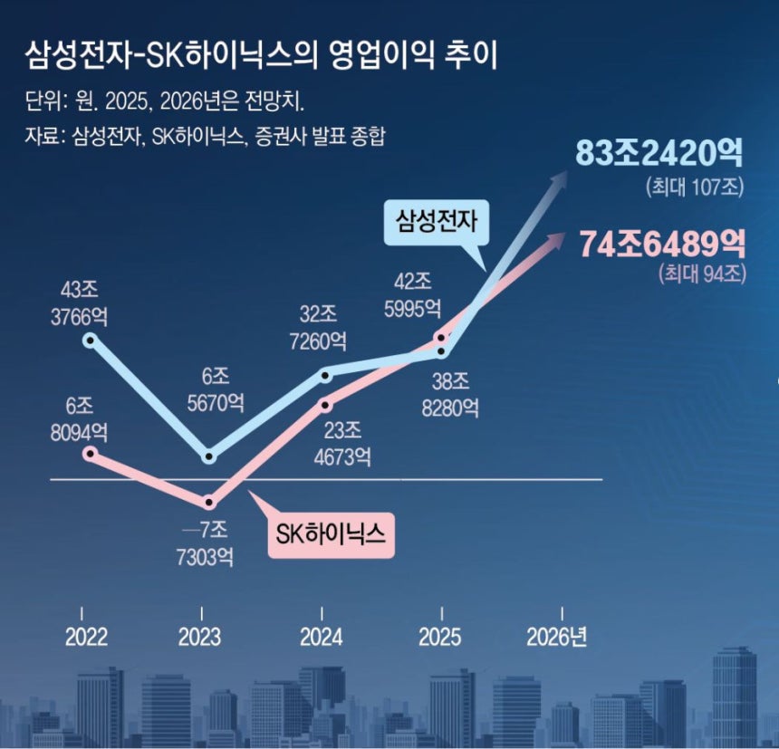 14일 증권가에 따르면 키움증권은 삼성전자의 2026년 연결 기준 영업이익 전망치를 107조6120억 원으로 상향했다.이는 기존 증권가 컨센서스(최근 3개월간 증권사 추정치 평균)인 83조2420억 원 대비 29.3% 높은 수준이다.iM증권은 같은 기간 SK하이닉스의 내년 연결 기준 영업이익 전망치를 93조8430억 원까지 끌어올렸다.가장 긍정적인 전망치를 합산하면 두 회사 영업이익이 200조 원을 넘게 된다.