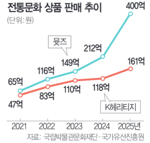 2일 문화체육관광부에 따르면 국내에서 전통문화 상품을 판매하는 공공기관은 문체부 산하 국립박물관문화재단과 국가유산청 산하 국가유산진흥원이다.가장 규모가 큰 국립박물관문화재단이 만든 문화상품 브랜드‘뮷즈(박물관+굿즈)’의 지난해 매출액은 400억 원인 것으로 잠정 집계됐다.이는 2024년(212억 원)에 비해 100% 가까이 늘어난 것이다.