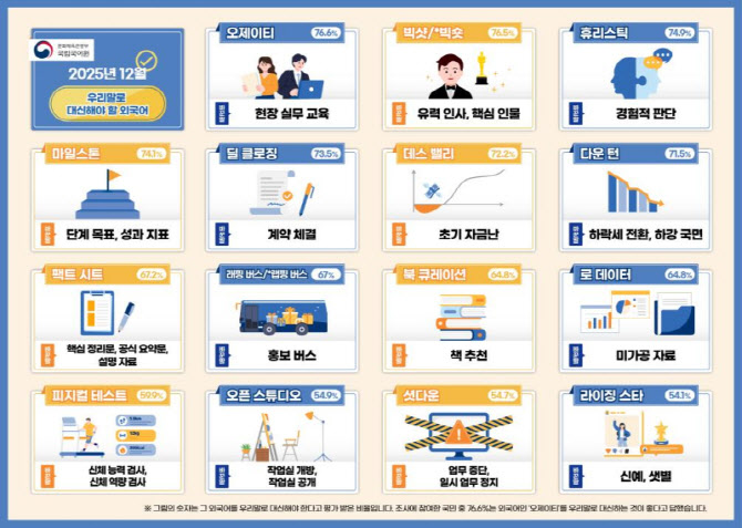콘텐츠 분야 전문용어 65개도 쉬운 말로[이데일리 장병호 기자] 문화체육관광부(문체부)와 국립국어원(이하 국어원)은‘오제이티’(OJT)‘휴리스틱’(heuristic) 등의 외래 용어 15건을 쉬운 우리말로 다듬었다고 23일 밝혔다.