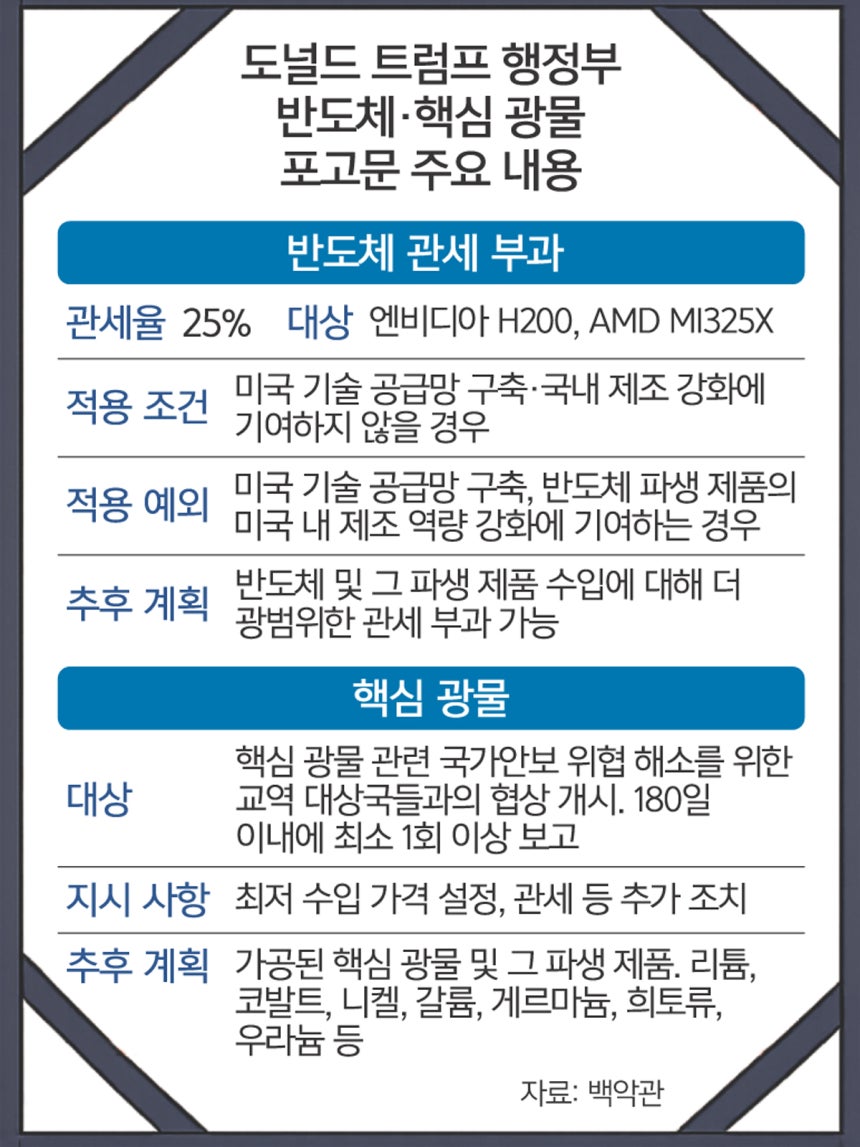 그러나 이 구조가 미국 헌법이 금지하는‘수출세’에 해당할 수 있다는 지적이 법조계와 정치권에서 잇따랐고,행정부가 중국을 빌미로 특정 기업과 사실상 뒷거래를 맺었다는 비판까지 나왔다.이날 행정명령은 수출대금의 일정 비율을 직접 떼는 대신,H200·MI325X처럼 미국을 경유하는 고급 AI 칩의 원재료 수입 단계에 25% 관세를 부과하는 방식을 도입해,법적 논란을 피하면서 중국행 AI 칩 매출 일부를 미국이 흡수하는 효과를 누리는 방안으로 해석된다.