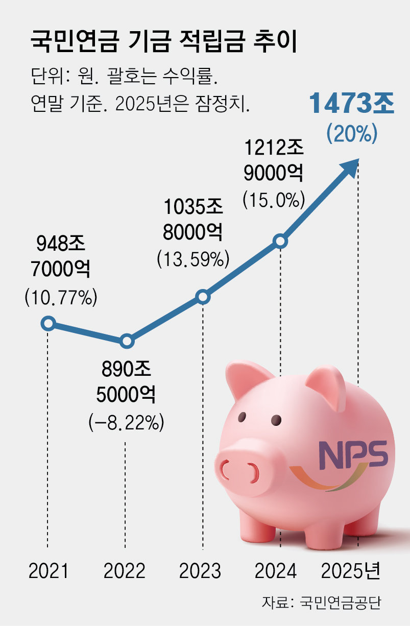 이 같은 수익률 덕분에 전체 기금 규모는 지난해 말 1213조 원에서 올 12월 잠정치 기준 1473조 원으로 늘었다.1년 새 260조 원(21.4%) 급증한 것으로,지난해 연금 급여로 지급한 44조 원의 5.9배에 달한다.