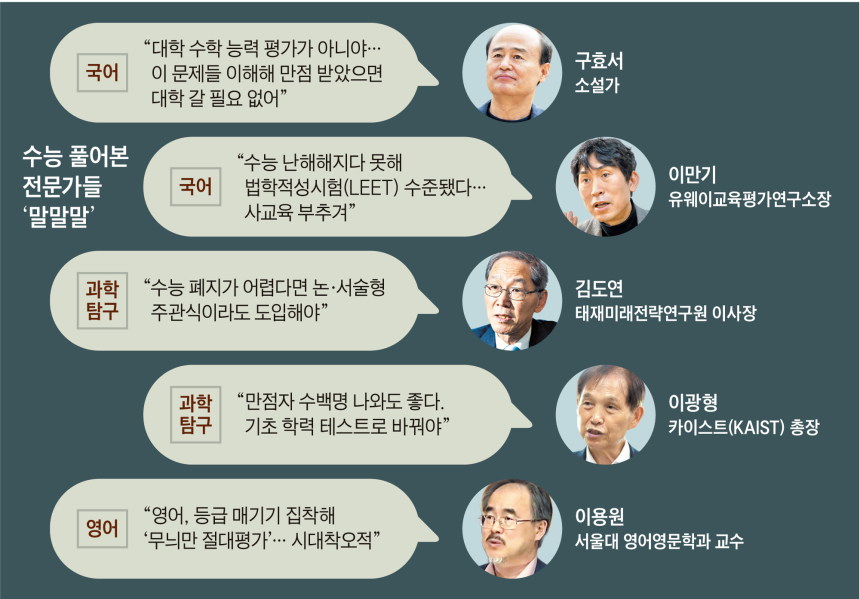 국어 교사 출신으로 EBS 등을 거친 입시 전문가 이만기 유웨이교육평가연구소장 역시 5개 문제를 풀어보고 “다 맞히기는 했지만 솔직히 시간은 초과했다”고 말했다.그는 “수능이 갈수록 난해해지더니 몇몇 문제는 법학적성시험(LEET) 수준까지 온 것 같다”며 “과도한 줄 세우기식 상대평가인 수능 때문에 사교육 의존이 더 심해지는 것”이라고 했다.이 소장은 “수능은 기초 학습 소양을 평가하는 자격고사로 전환하고 대학의 선발 자율권을 강화하자”고 했다.