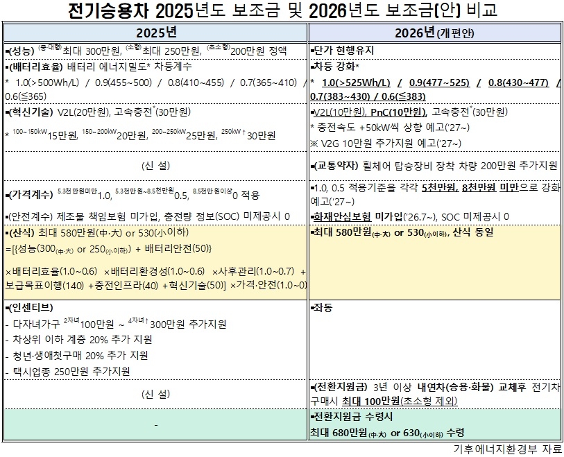 ▶이달 말 또는 다음달 초 구매 보조금 신청 가능 =기후에너지환경부는 이달 2일부터 9일까지‘2026년도 전기차 구매보조금 개편방안(이하 보조금 개편안)’에 대한 공개 의견수렴을 진행했다.