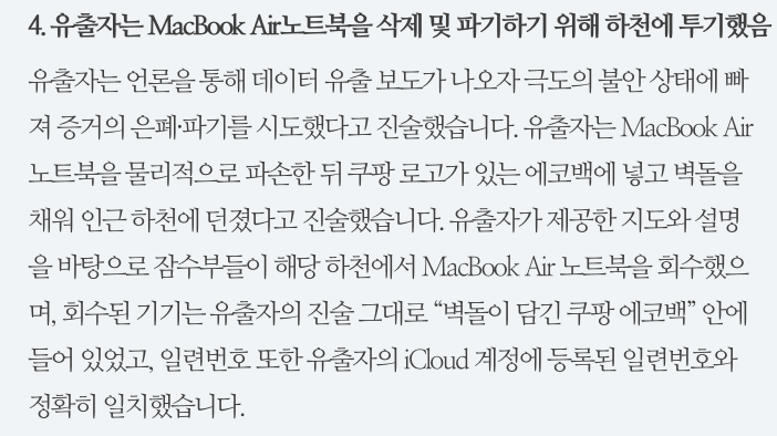 관건은 쿠팡이 잠수부까지 고용해서 건져냈다는 피의자의 노트북(애플 맥북에어)을 분석하는 작업이다.쿠팡의 발표 내용을 곧이곧대로 듣지 않고 해당 제품이 실제로 피의자가 개인정보를 빼내는 데 활용한 것인지 등을 확인해야 한다.