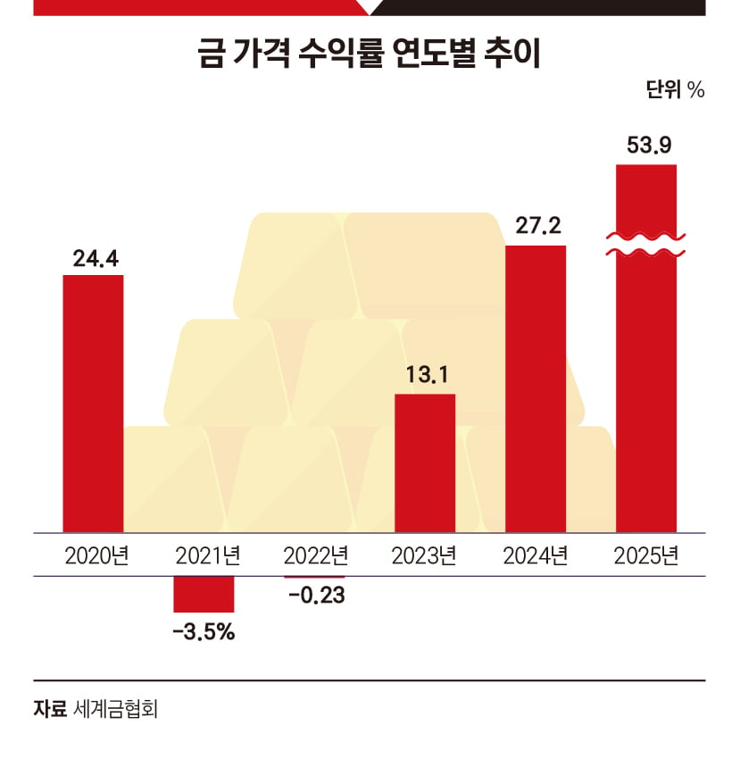 실제로 금은 지난 한 해 동안 50회 이상 사상 최고치를 경신하며 1971년 금 본위제 폐지 이후 역대 4위에 해당하는 60%의 연간 수익률을 기록했다.이러한 폭등은 지정학적 위험 증가,미국 달러 약세,그리고 각국 중앙은행의 공격적인 금 매수가 복합적으로 작용한 결과다.