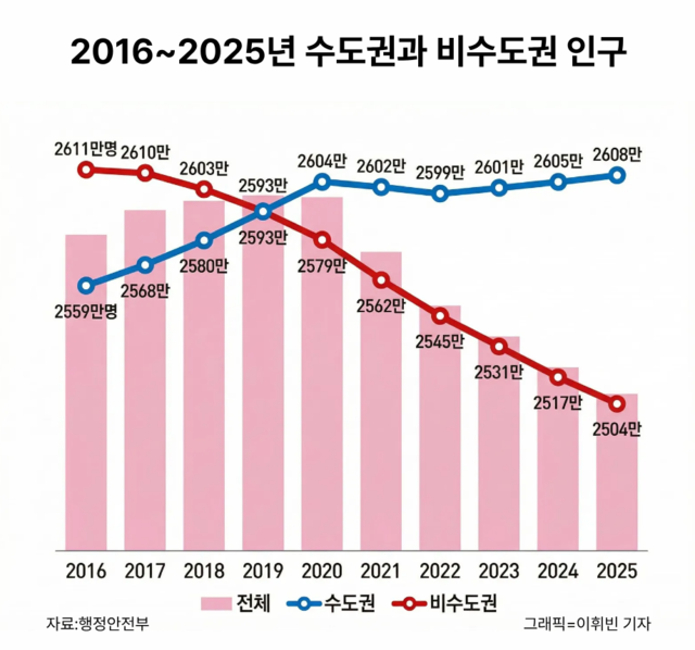 광역시도 가운데 인구가 늘어난 곳은 6곳에 그쳤다.경기(3만5450명)와 인천(3만951명)이 도드라졌고,충북·대전·세종·충남도 소폭 증가했다.서울은 3만2280명 줄었으며,부산·경북·경남 등 다수 지역에서 감소세가 이어졌다.
