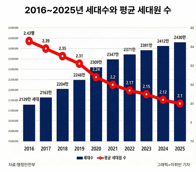 전체 세대 가운데 1인 세대는 1027만 세대로 42.27%를 차지했다.10가구 중 4가구 이상이 혼자 사는 가구이다.전년 대비 1.48% 증가했다.2인 세대는 25.31%,3인 세대는 16.77%로 나타났다.