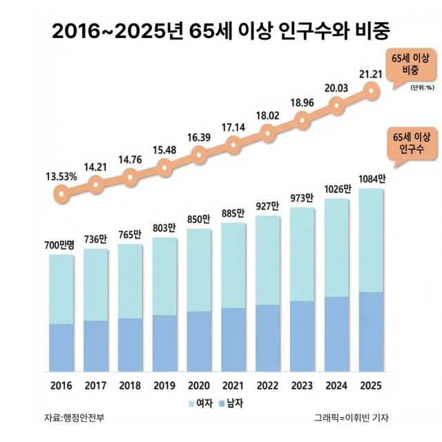 행정안전부가 4일 발표한‘2025년 주민등록 인구통계 분석’에 따르면 지난해 기준 65세 이상 고령 인구는 1084만명으로 2024년보다 58만명 늘었다.전체 주민등록 인구 5112만명 가운데 고령 인구 비중은 21.21%로 집계됐다.