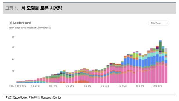 아울러 “오픈라우터가 발표하는 AI 모델별 토큰 사용량은 올해 1분기부터 4분기까지 꾸준히 상승하고 있다.특히 올해는 기업의 AI 모델 사용이 수요를 견인하고 있다”며 “에이전트 AI 사용이 이제 막 시작된 점을 고려하면 AI 수요에 대해 우려할 시점은 아니다”라고 강조했다.