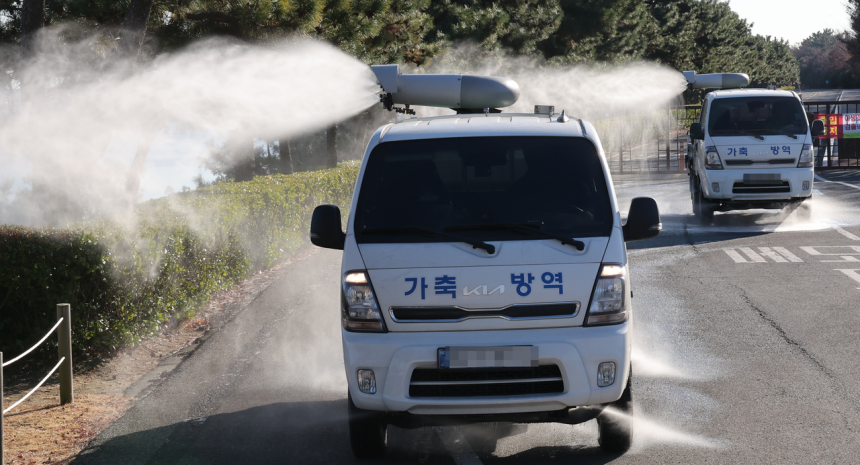 9일 오후 부산 사하구 을숙도 생태공원 일원에서 축협 관계자들이 차량을 이용 방역 소독을 하고 있다.기사 내용과 무관한 사진.[연합]