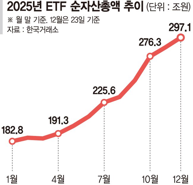 23일 한국거래소에 따르면 이날 기준 국내 ETF 순자산총액은 297조1432억원으로 역대 최대 규모다.지난해 말 173조원에서 불과 1년 만에 120조원 넘게 급증한 수치다.연초 대비 증가율도 70%에 육박한다.월말 기준 ETF 순자산총액은 올해 내내 가파른 우상향 흐름을 이어왔다.올해 1월 182조8000억원에서 4월 191조3000억원,7월 225조6000억원,9월 249조8000억원으로 빠르게 불어났다.10월에는 276조3000억원,11월에는 286조3000억원까지 확대되는 등 매달 10조원 안팎으로 증가했다.