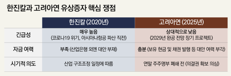 한진칼 분쟁 당시엔 코로나19 위기로 아시아나항공이 파산 직전까지 가는 등 유상증자의 긴급성이 매우 높았고,산은 외엔 대안이 없었다는 점에서 자금 조달의 필요성도 높았다.시기적인 문제 역시 산업 구조조정 일정에 따라 진행됐던 만큼 특정 기간을 임의로 맞추려는 시도도 없었다.