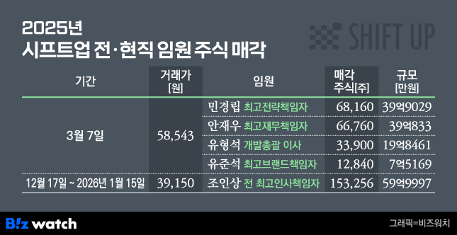 지난 3월7일 민경립 시프트업 최고전략책임자(CSO)가 6만8160주,안재우 최고재무책임자(CFO)가 6만6760주,유형석 개발총괄 이사가 3만3900주,유준석 최고브랜드책임자(CBO)가 1만2840주를 시간외매매 방식으로 각각 매각했다.